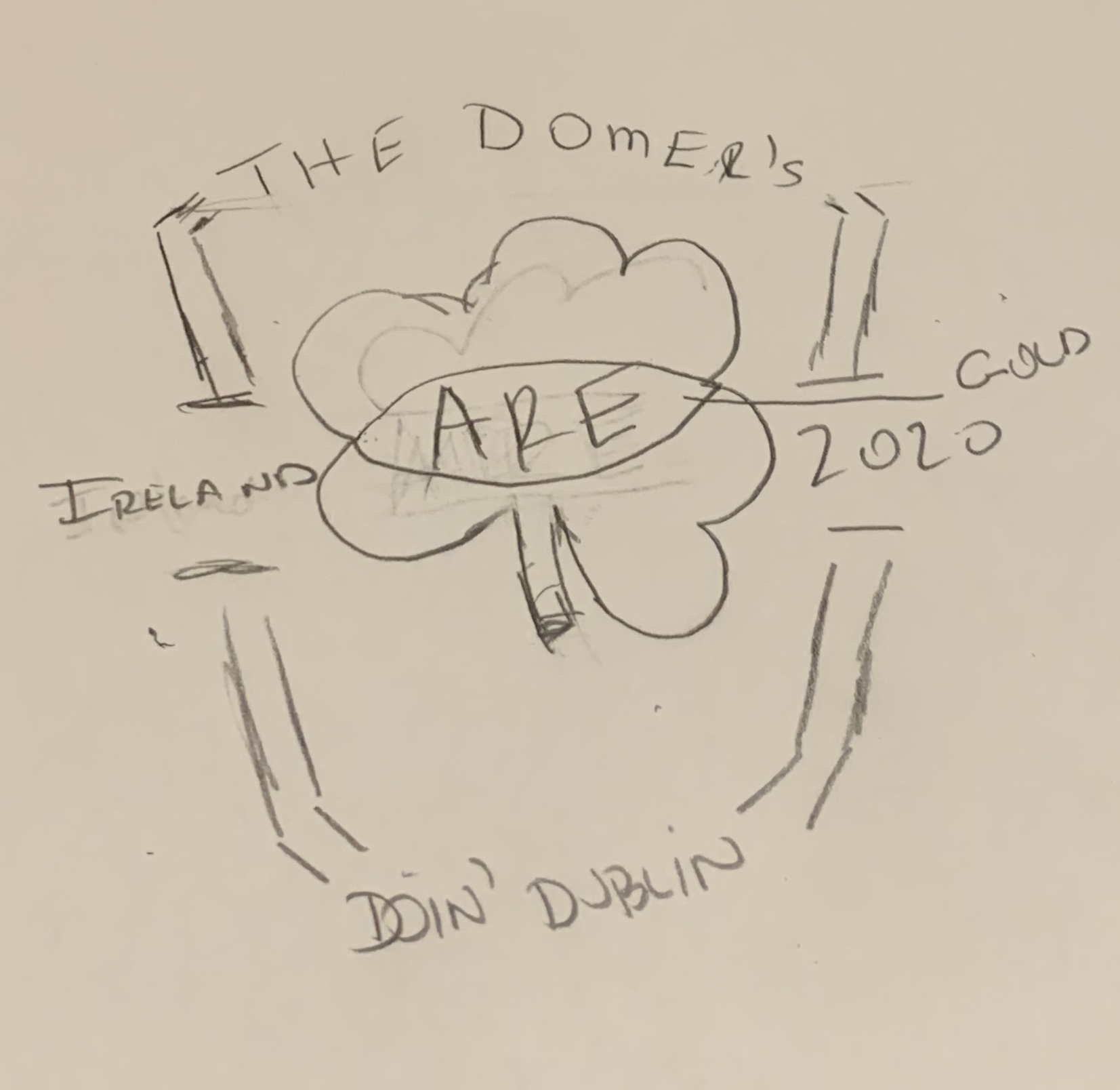 1.) T-shirt should have front and back design. <br/>2.) T-shirt color needs to be green (see upload)<br/>3.) Needs to include Notre Dame’s school colors (see upload) and Notre Dame type needs to be Adobe Garamond typeface. <br/>4.) Front of t-shirt should include:<br/>a.) the phrase: The Domer’s doin’ Dublin<br/>b.) a blue shamrock with gold outline (see upload)<br/>5.) Back of t-shirt should include the following: a.) Notre Dame vs. Navy<br/>b) Dublin, Ireland<br/>c.) August 29, 2020