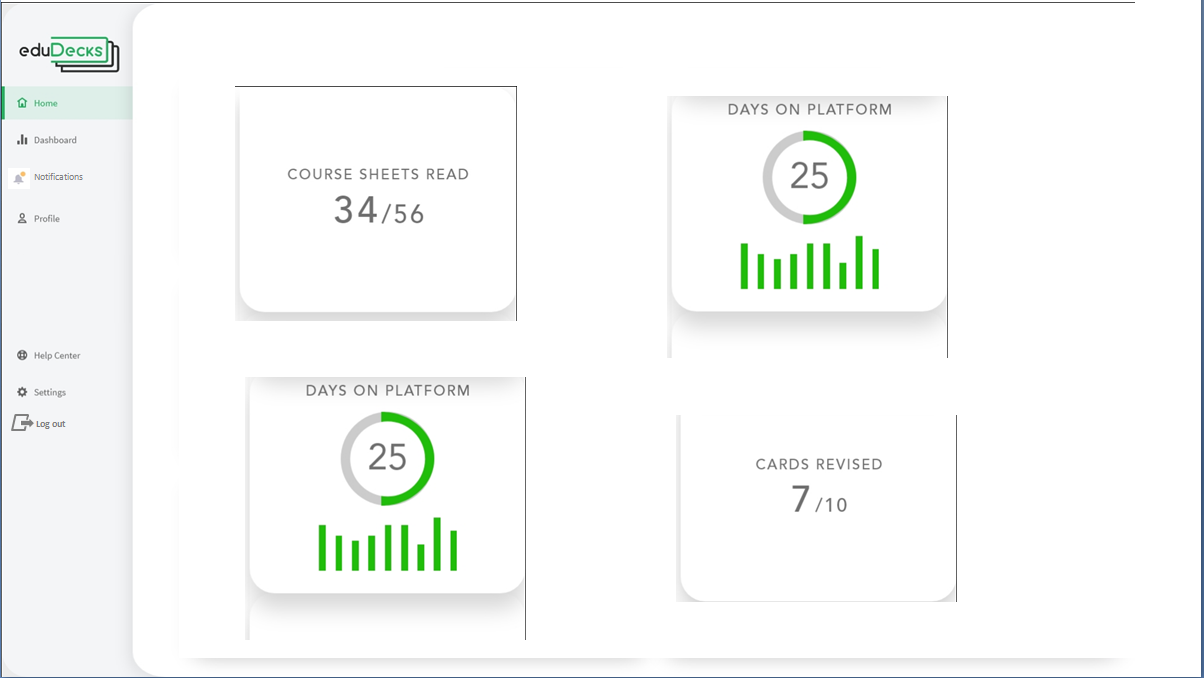 • Personal dashboard, retracing the courses taken, the number of revised cards and other metrics