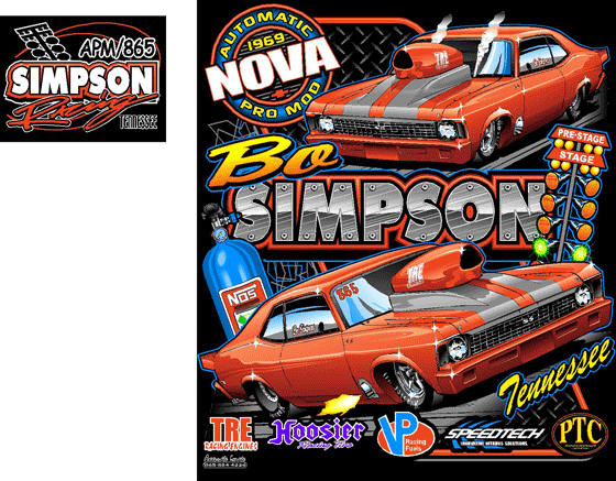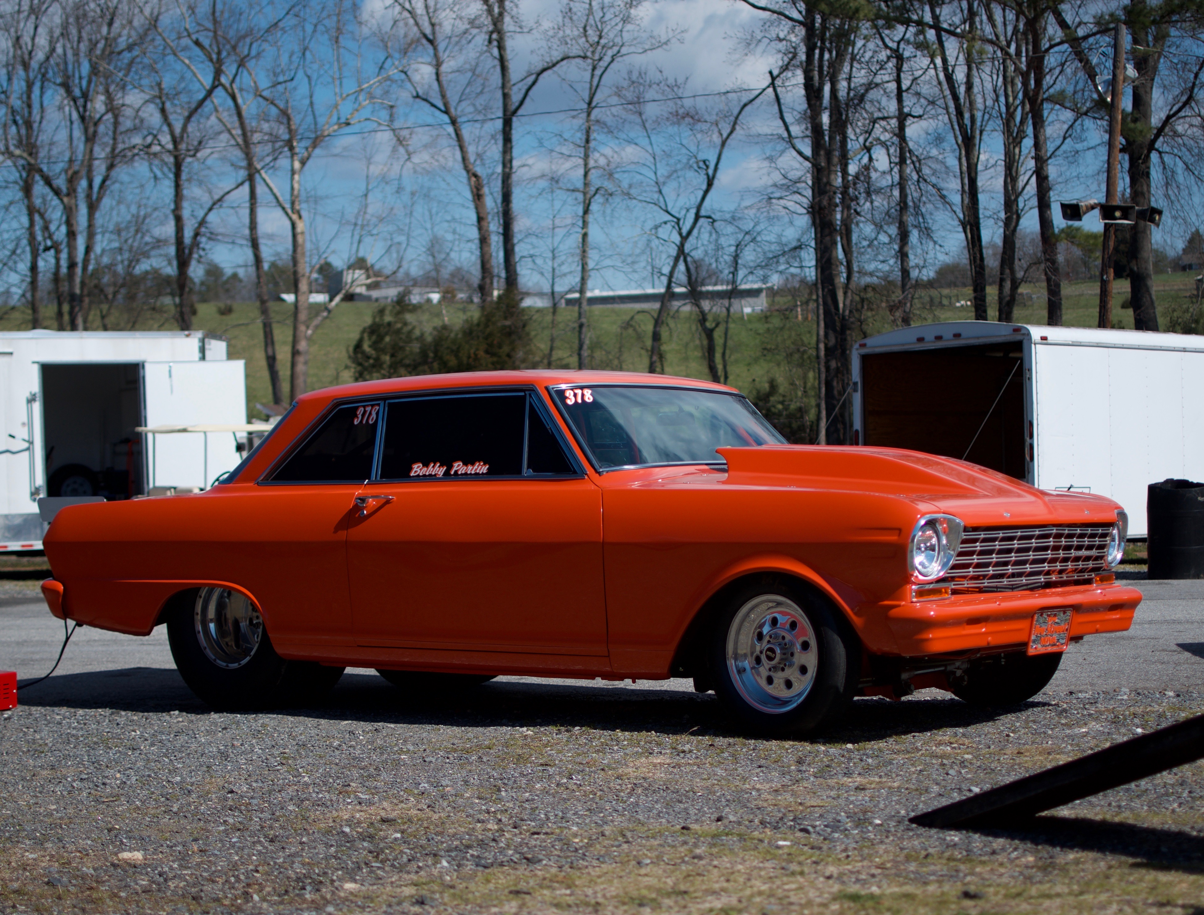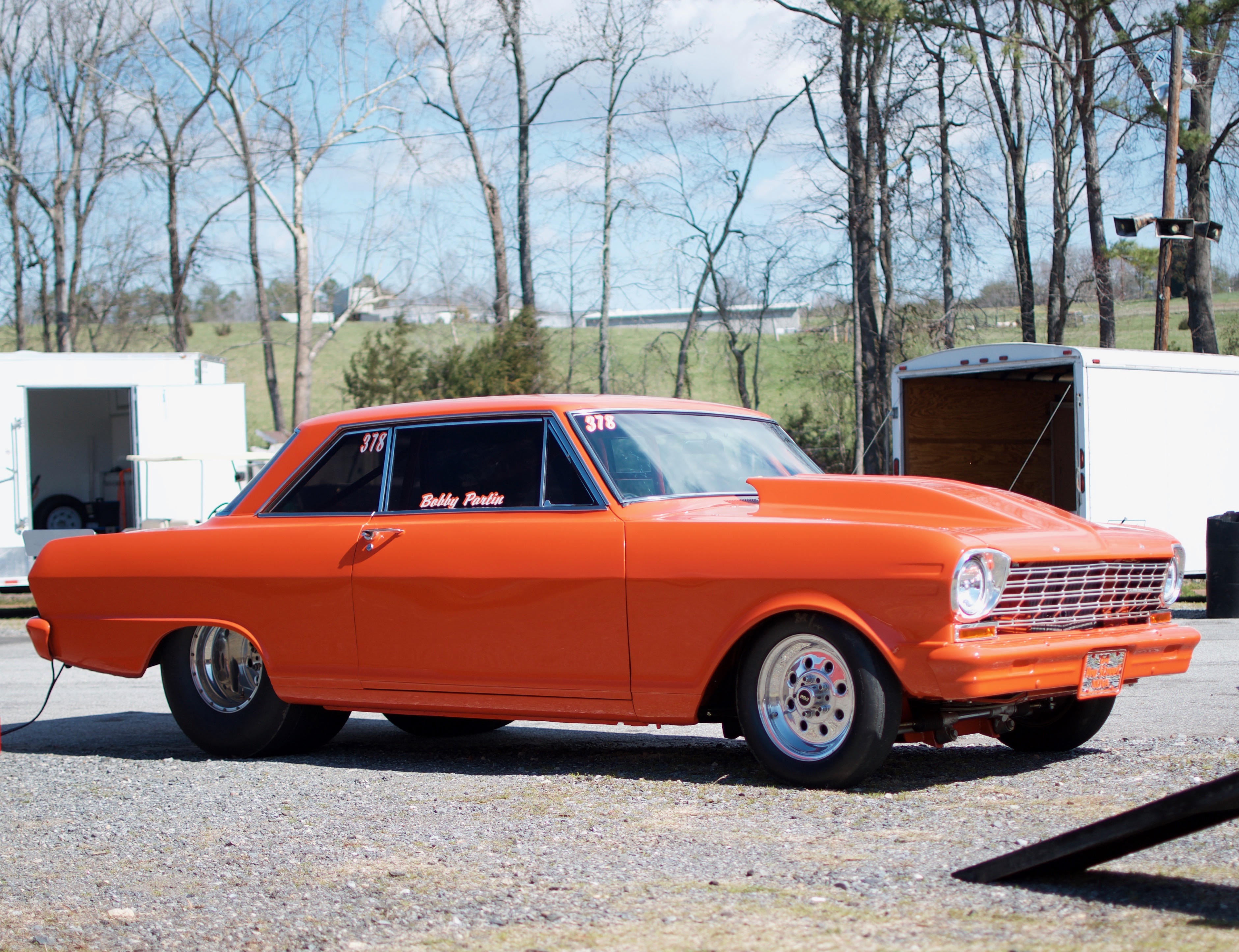 We need a t-shirt design for a drag racing car. The car is an orange 1964 Chevy Nova with the nickname "The Crush". Bobby Partin in the driver and his car number is 378. Partin Racing is the team name. We would like his name and number on the windows like in the picture, and also a tag on the front like the picture. It's a mirrored tag with the writing '64 Pro Street Nova, in orange. We would also like the front of the shirt to have Partin Racing in the pocket area. We are planning on putting the design on a black, or gray shirt.