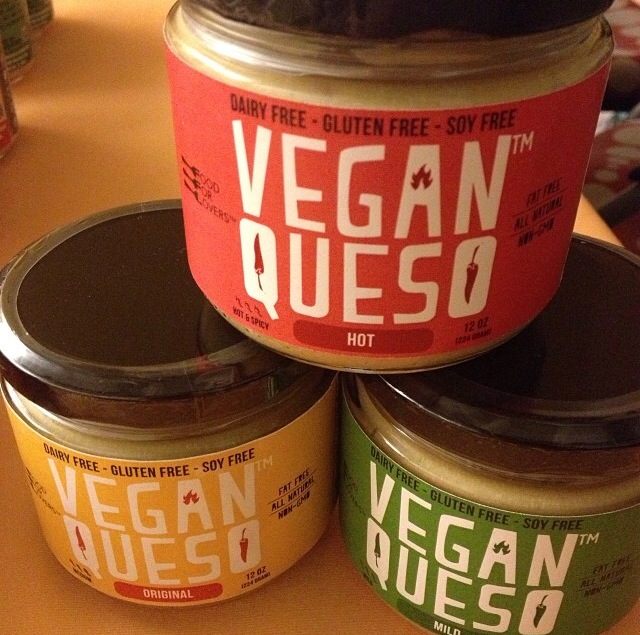 The picture (attached) of Vegan Queso is the closest to what we are going for. Because the sauce is creamy white, a colorful background with off-white font will be best.