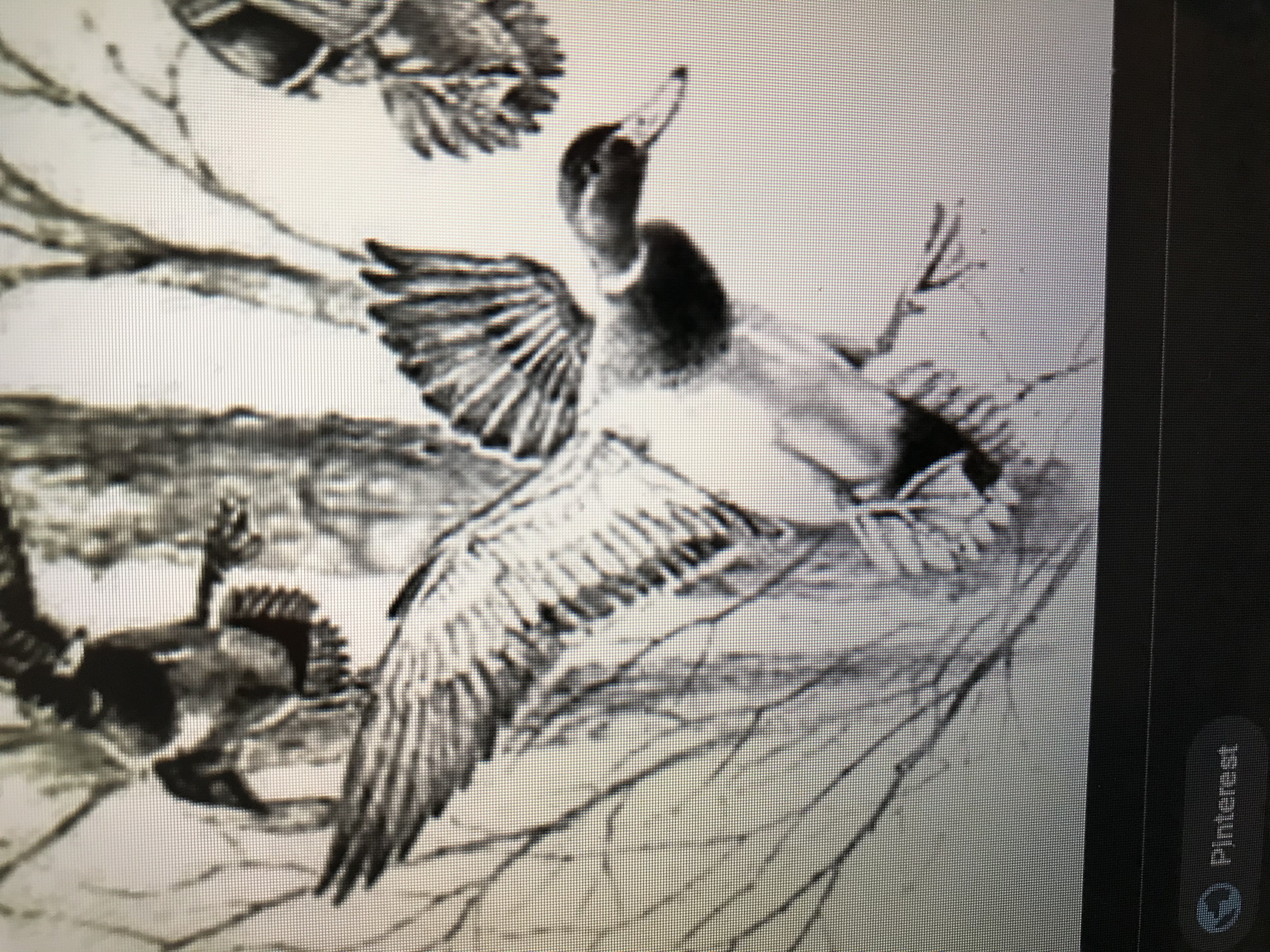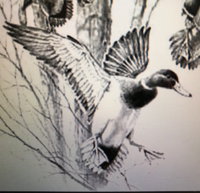 b) Mallard duck - PLEASE LOOK AT THE PHOTO OF A DUCK COMING DOWN AT AN ANGLE. THE ANGEL SHOWS THE DUCKS FACE BETTER THAN A HEAD-ON APPROACH. a duck with wings cupped dropping down toward you - be sure he looks like a Mallard Drake duck