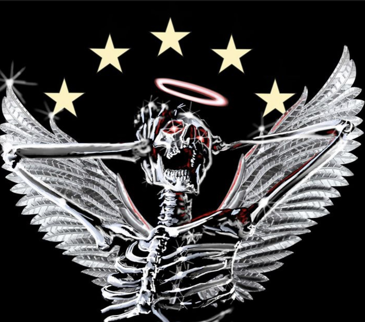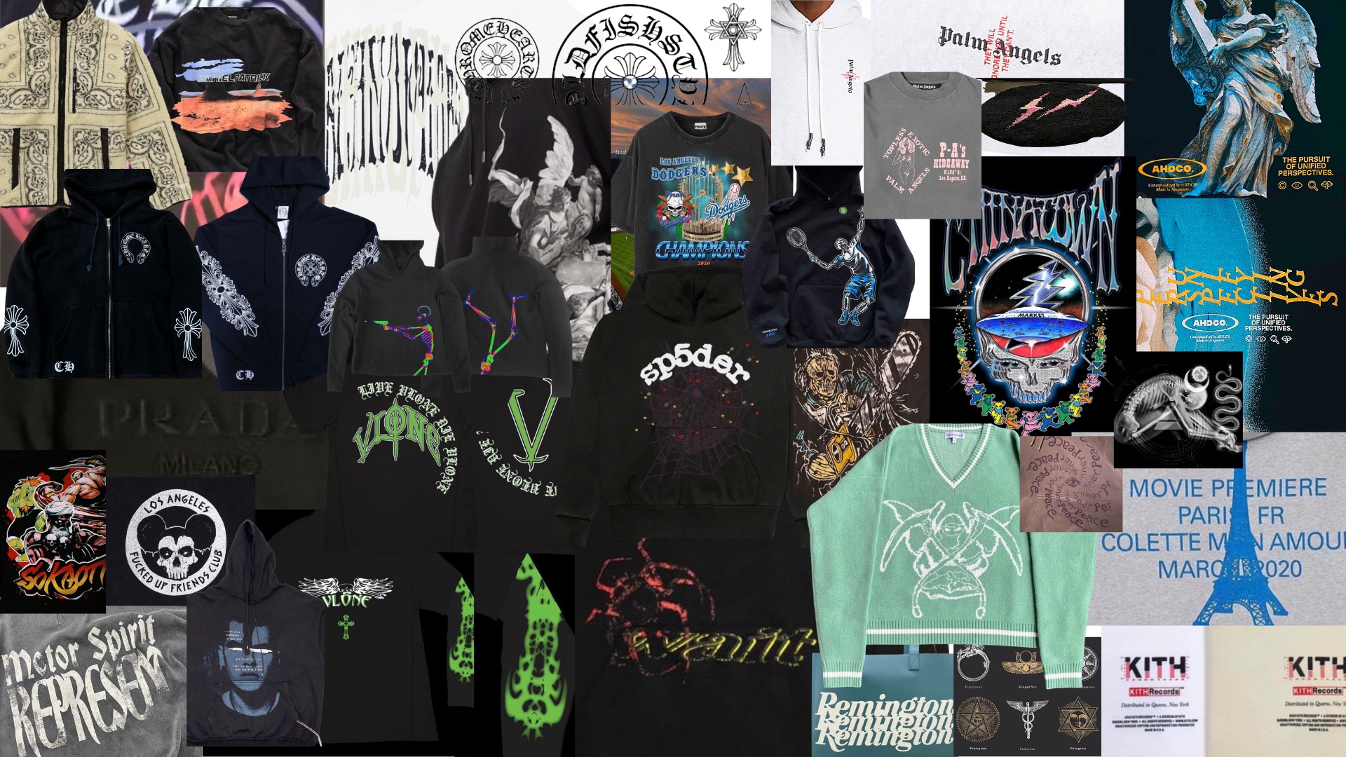 and just flipped to 180. Extra wording and inspo from board. I love the chrome skeleton with the stars maybe we can replace those stars with other things from the board & also see if we can make that skull have a ski mask and remove the halo. And have the “Suspect” scripture over it. I also really like the “Low key” and same color blending vibes with subtle details that make the design and the scripture blend with each other as well as a little distrotion. Any attempts and innovation is accepted. Just looking for stratwear design. Inspiration brands and pieces we love included in mood board aswell as Chrome Hearts, Siberia Hills, Sp5der, Off White.