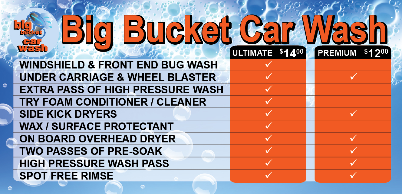 - This project must have the Ultimate and Premium options, the "bucket" and the Big Bucket Car Wash title. The orange is a key colour with blues for water.