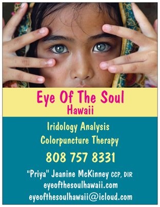 I am an Iridologist and Colorpuncture Therapist. Iridology analyzes the iris to find causes of disease. Colorpuncture is acupuncture without needles, combining with biophotonics, applying light frequencies on acupuncture points.