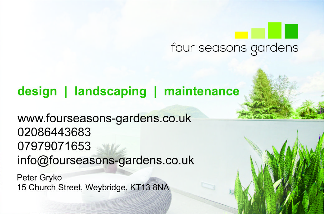 I need a business card for a company based in London, UK. I provide garden design, landscaping and maintenance services. The company specialises in modern, urban gardens. It must be horizontal design, white paper and black simple (easy to read) font. The print must be on clear, white surrounding. I like design that use the colours black, yellow, grey and different shades of green. The design must be tidy. It must not be overloaded with decorating. Embodied a small picture of a fragment of garden or plant or leaf in the sun (it must be yellowish and greenish). It would be good if it's "live and energetic". I attached all text and logo that have to appear on the card.