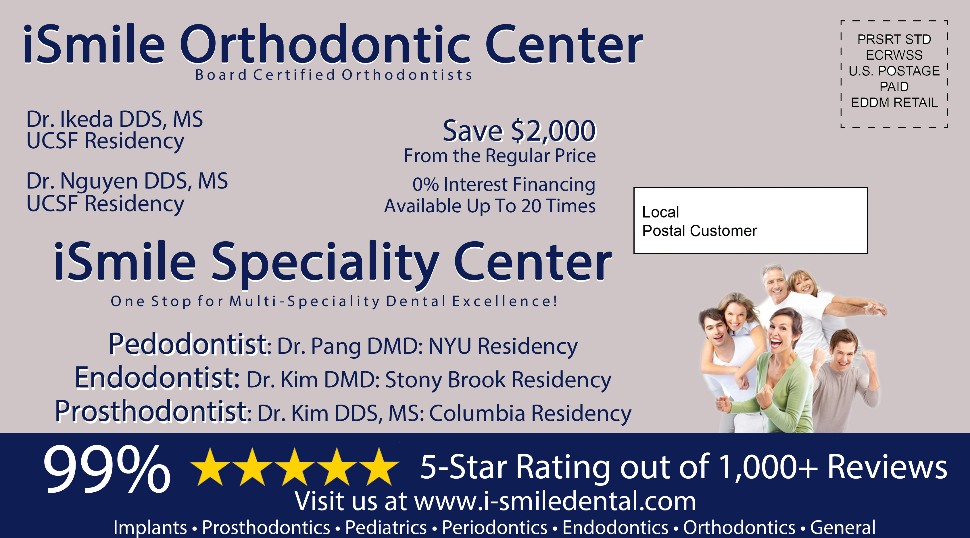 Hello, we are a high tech dental office located in Sunnyvale, CA. We are interested in finding a new design for our 6" x 11" EDDM Postcards (https://www.printpapa.com/templates/EDDM_POSTCARDS/11x6/11x6_eddm_template.jpg) to use to advertise our office. We need a design for the front and the back. We offer implants, prosthodontic, pediatric, endodontic, and orthodontic dentistry but we specialize in implants and braces so please make those promotions bigger, if possible! Our colors are the blue and white, as in our logo!