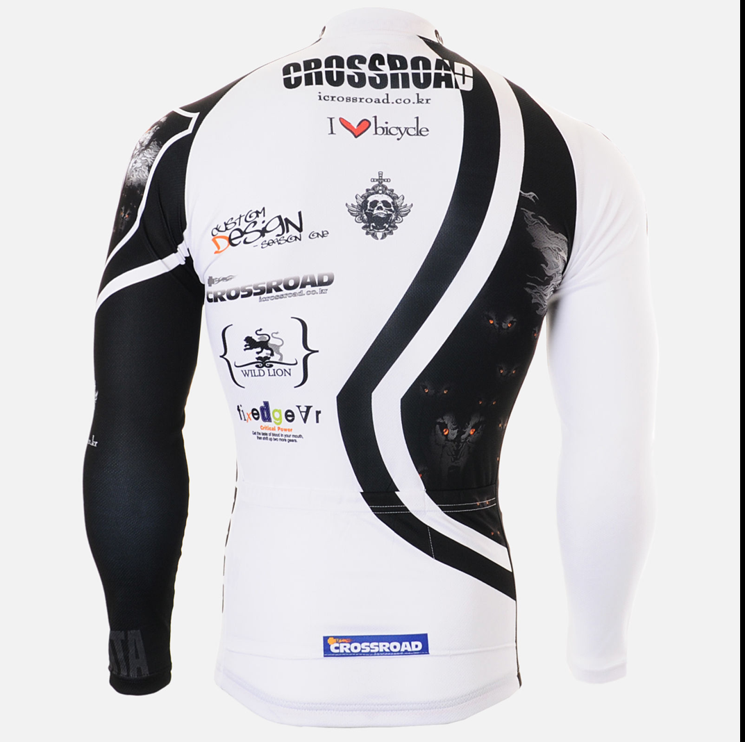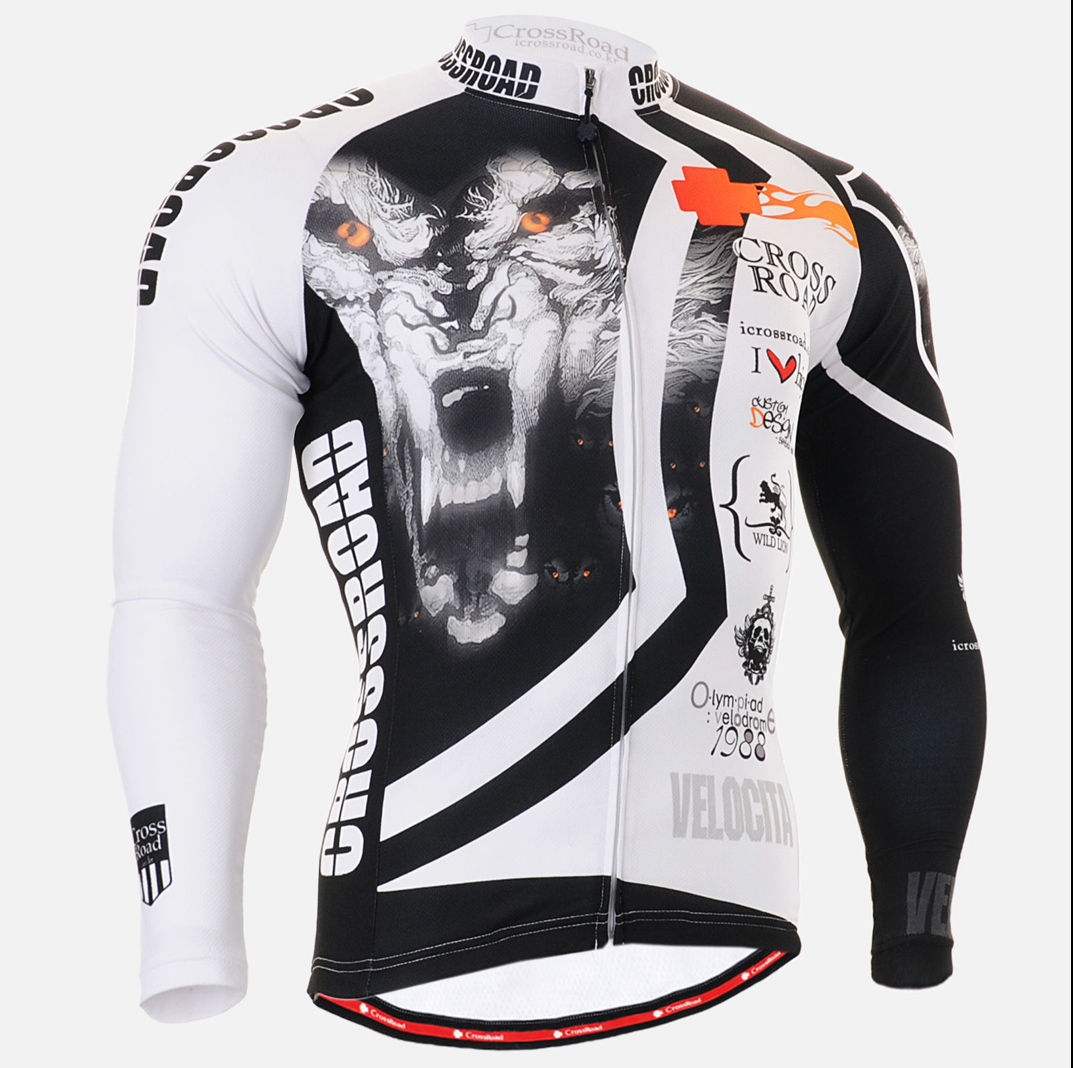 **I've just uploaded another file: 'Crossroad-wolf-jersey'. Please check it out. Like the other jersey designs I've uploaded for inspiration, this design includes some features that we like, but don't feel like you 'must' copy/use these features. They just might help with inspiration, that's all. We certainly don't need a wolf on our jersey!!, but we do like the combination of graphic (the wolf) that grabs your attention, together with the asymmetrical lines/pattern. The front black section more or less 'wraps' around to the back, with the help of a black side panel. And the front white section wraps to the back with the help of a white side panel. The small sponsor logos, or whatever they are on the front and back look good, too. There's a small touch of flames, as well, which is almost always cool! See more of the jersey, including back view here: http://www.ebay.com/itm/FIXGEAR-CS-2201-Men-Cycling-Jersey-design-road-bike-MTB-shirt-bicycle-Biking-Top-/321122750550