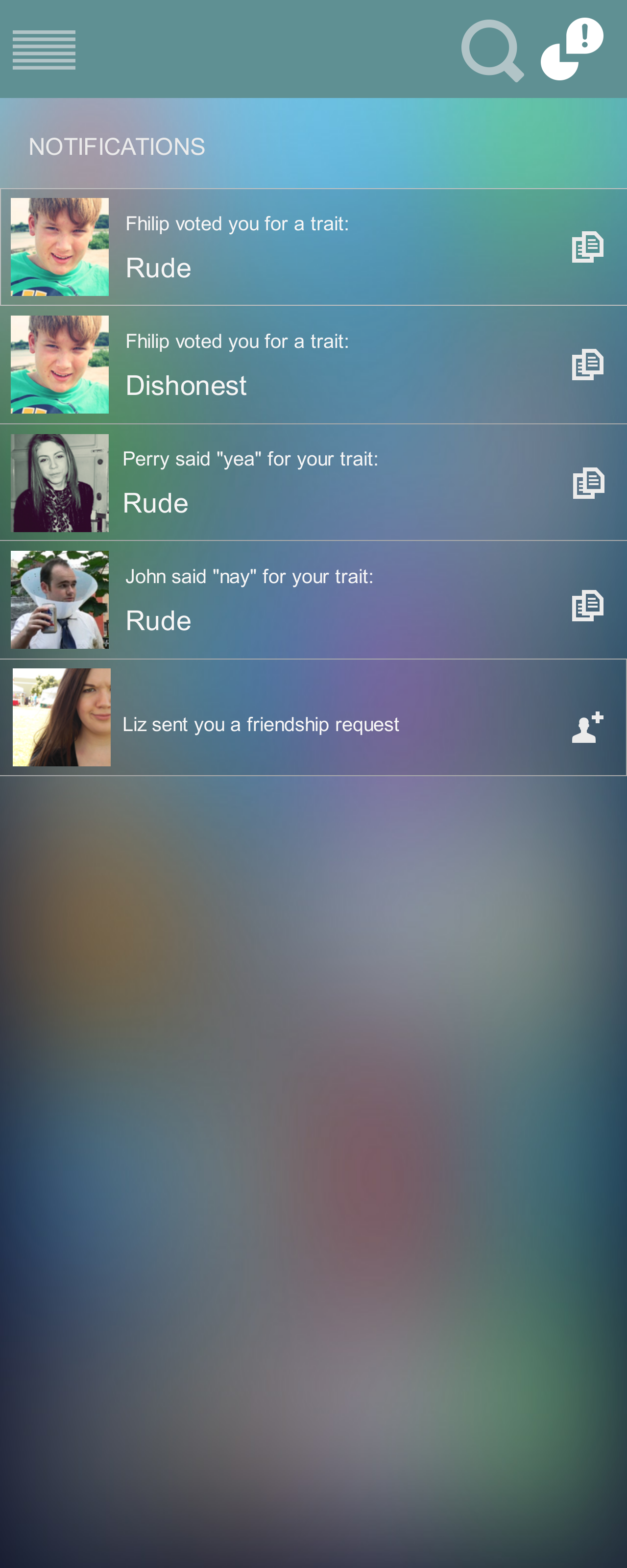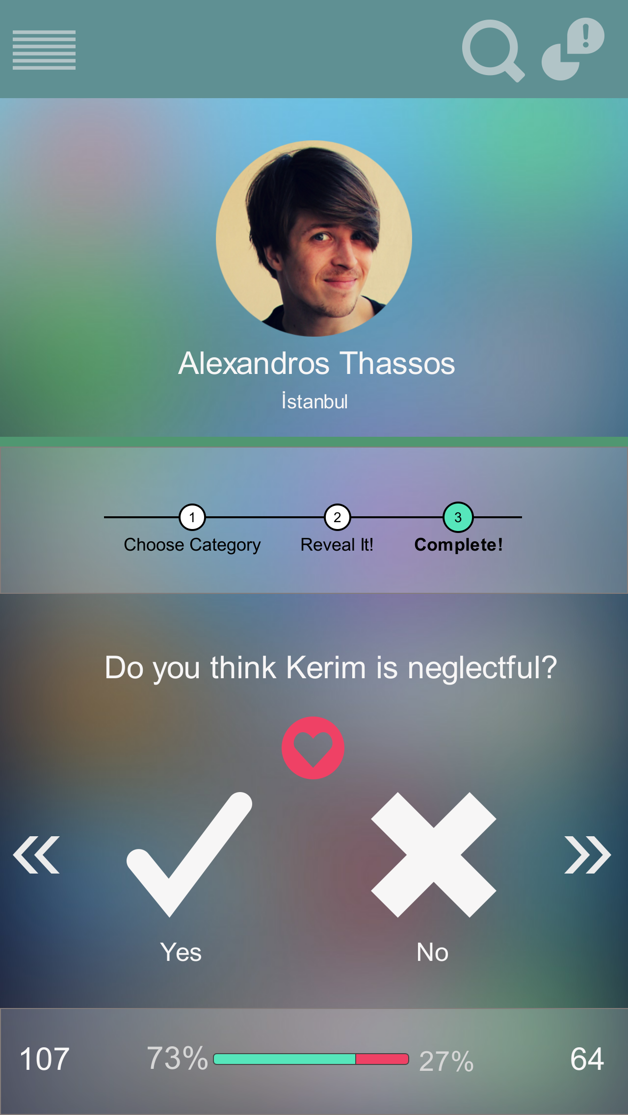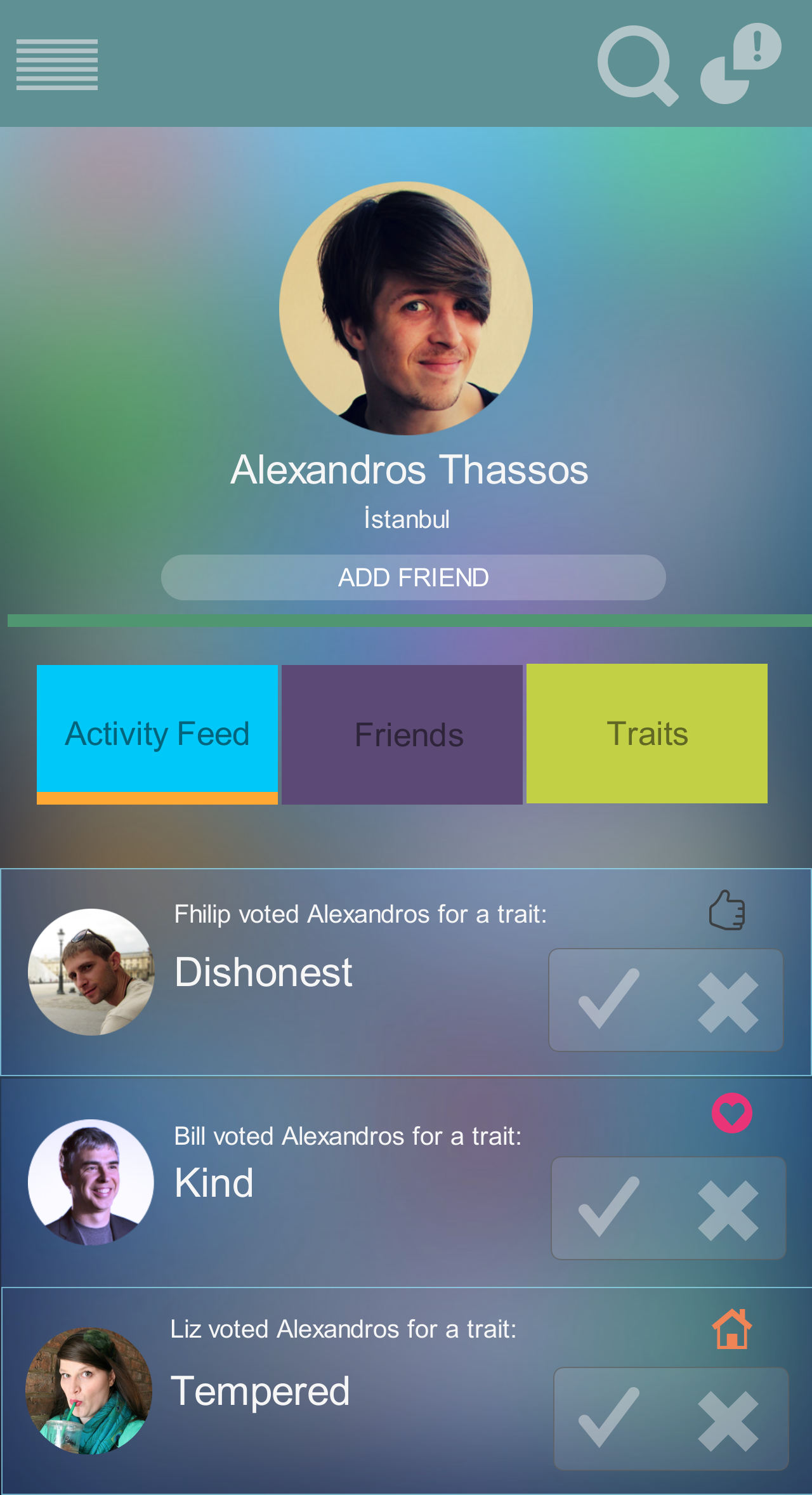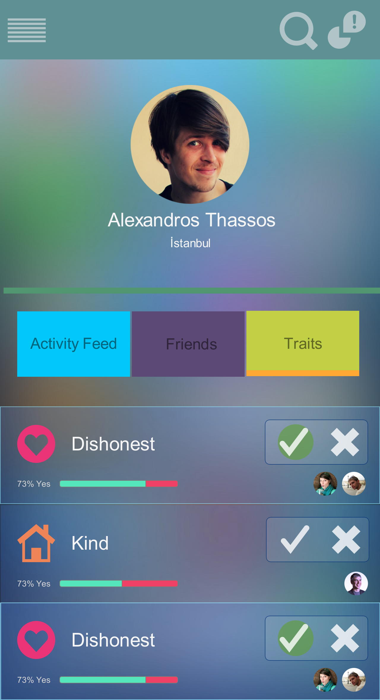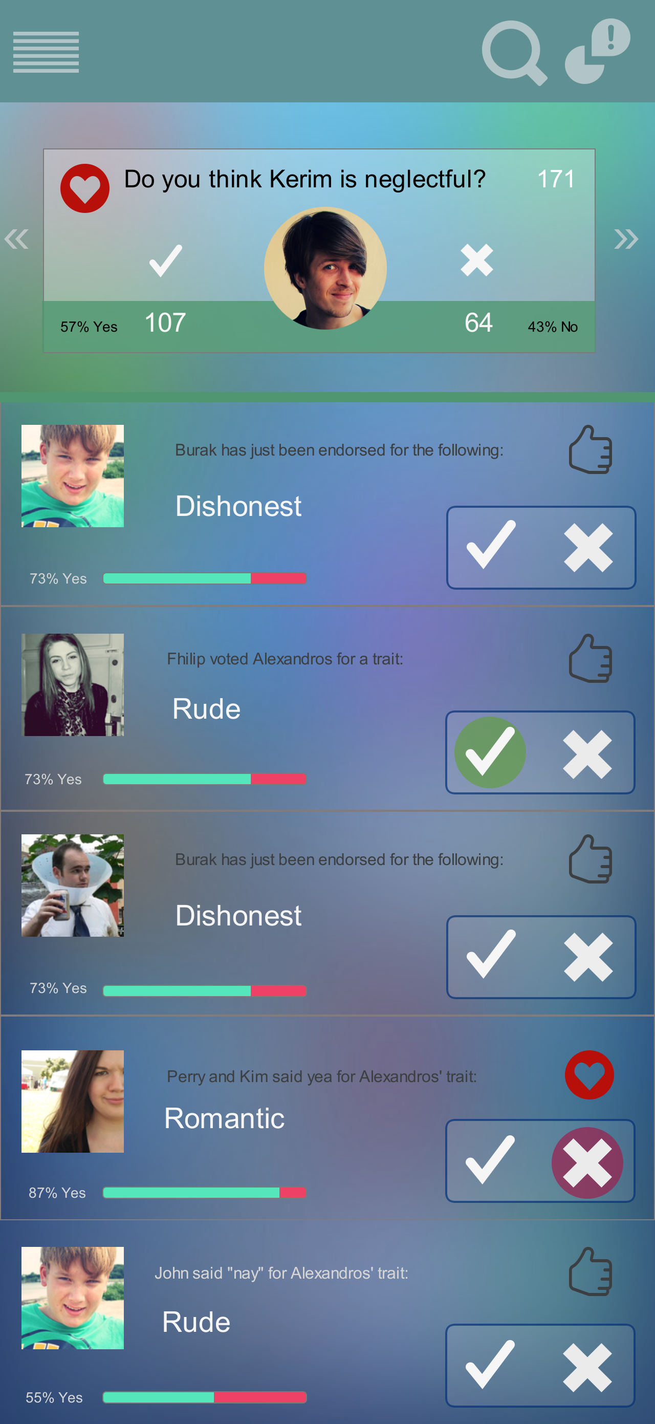Once the user taps any of the activity feed, the user can join the survey where Friend A is voted for some personal trait. Voting screen is a dedicated screen for this task where user can vote 'yea' or 'nay' for a given endorsement survey. Small fragments of information such as percentage of 'yea' votes or 'friends who voted for this' can also be displayed on this screen.