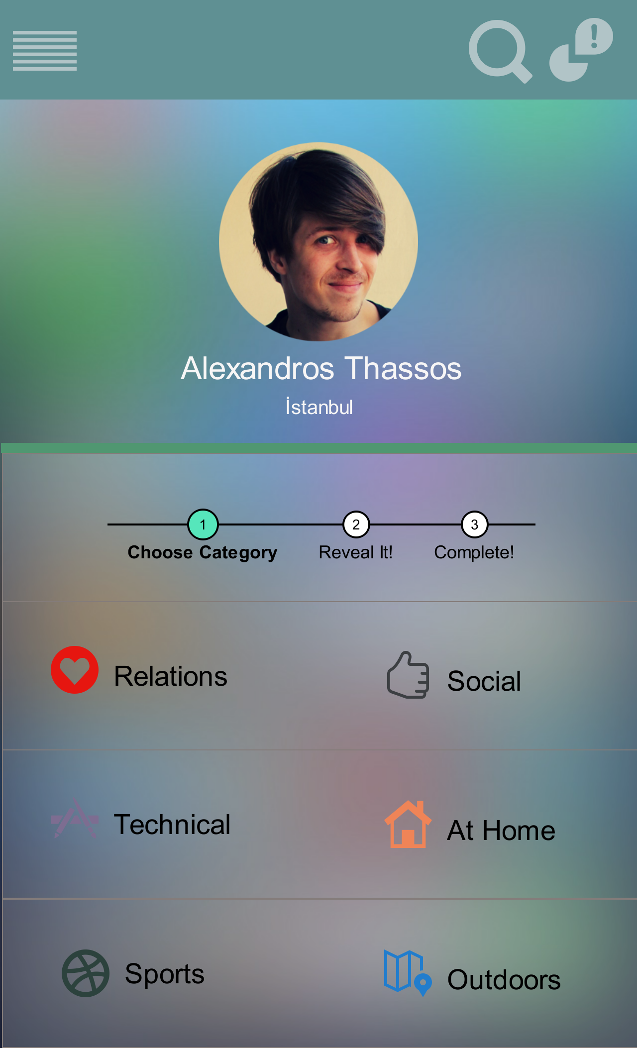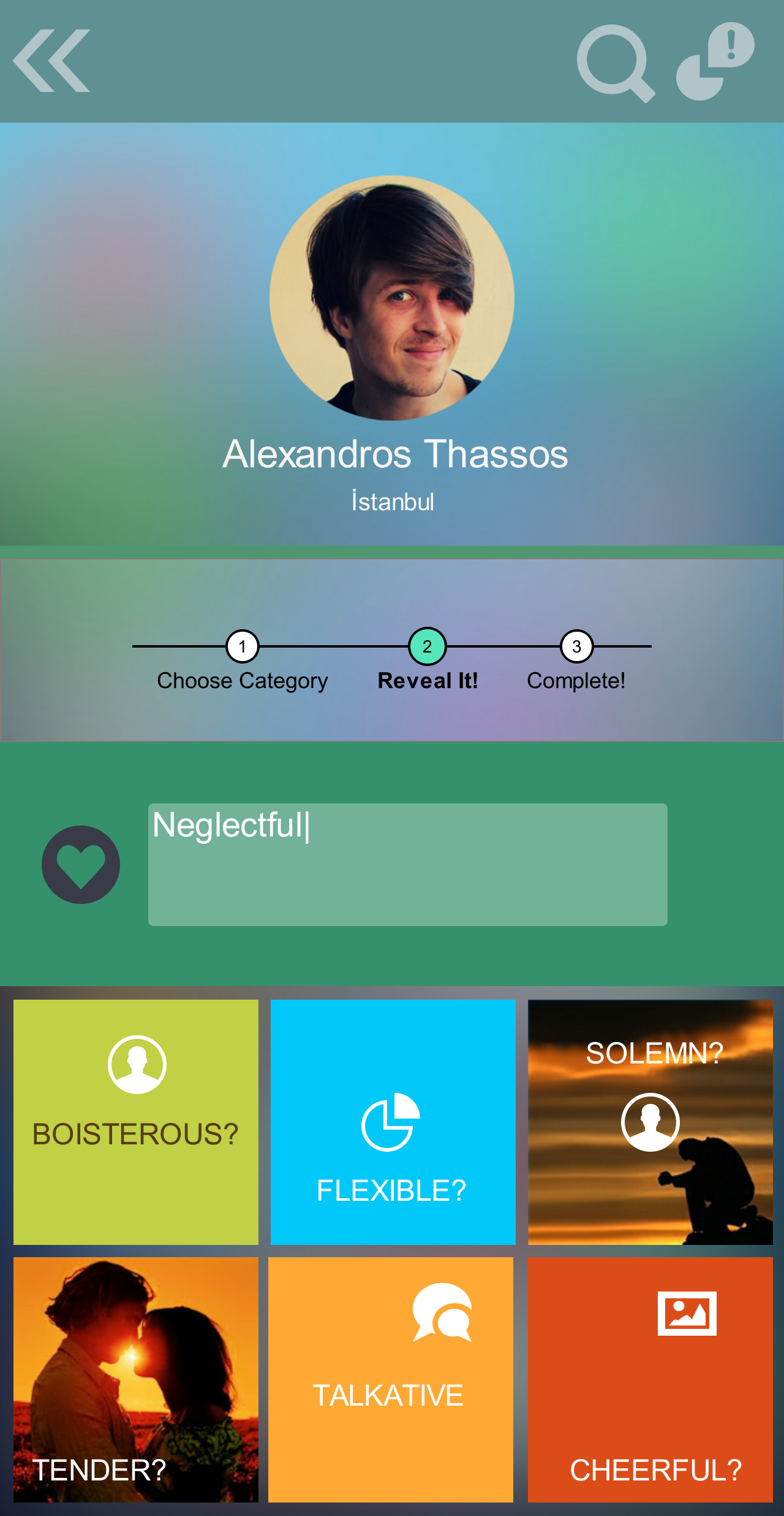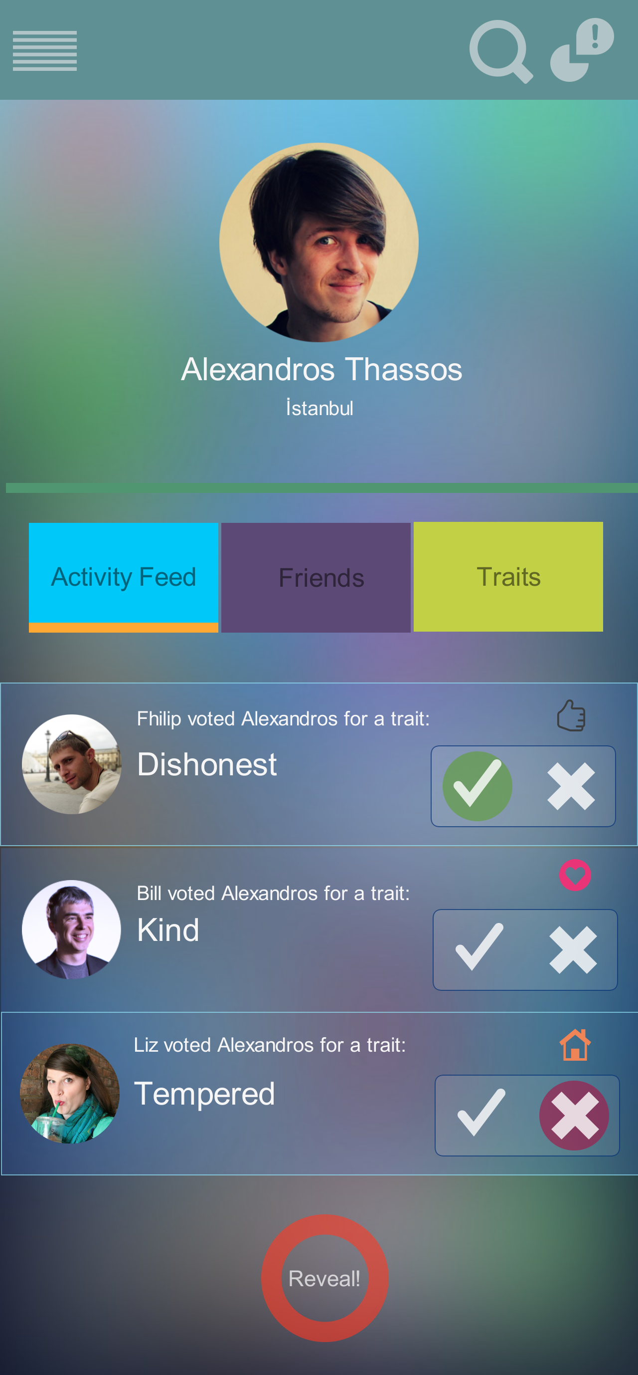 Revealing consists of three steps all of which correspond to a particular screen. In the first step, user chooses a category for the personal trait. There are currently six categories: Relations, Social, Technical, At Home, Sports and Outdoors. Once the category is chosen, second step of `reveal` process appears. Here, user can either choose traits from the list provided or he/she can type a new trait. Finally, in the 3rd screen of 'reveal' process, user can place a positive or negative vote on the endorsement he created.