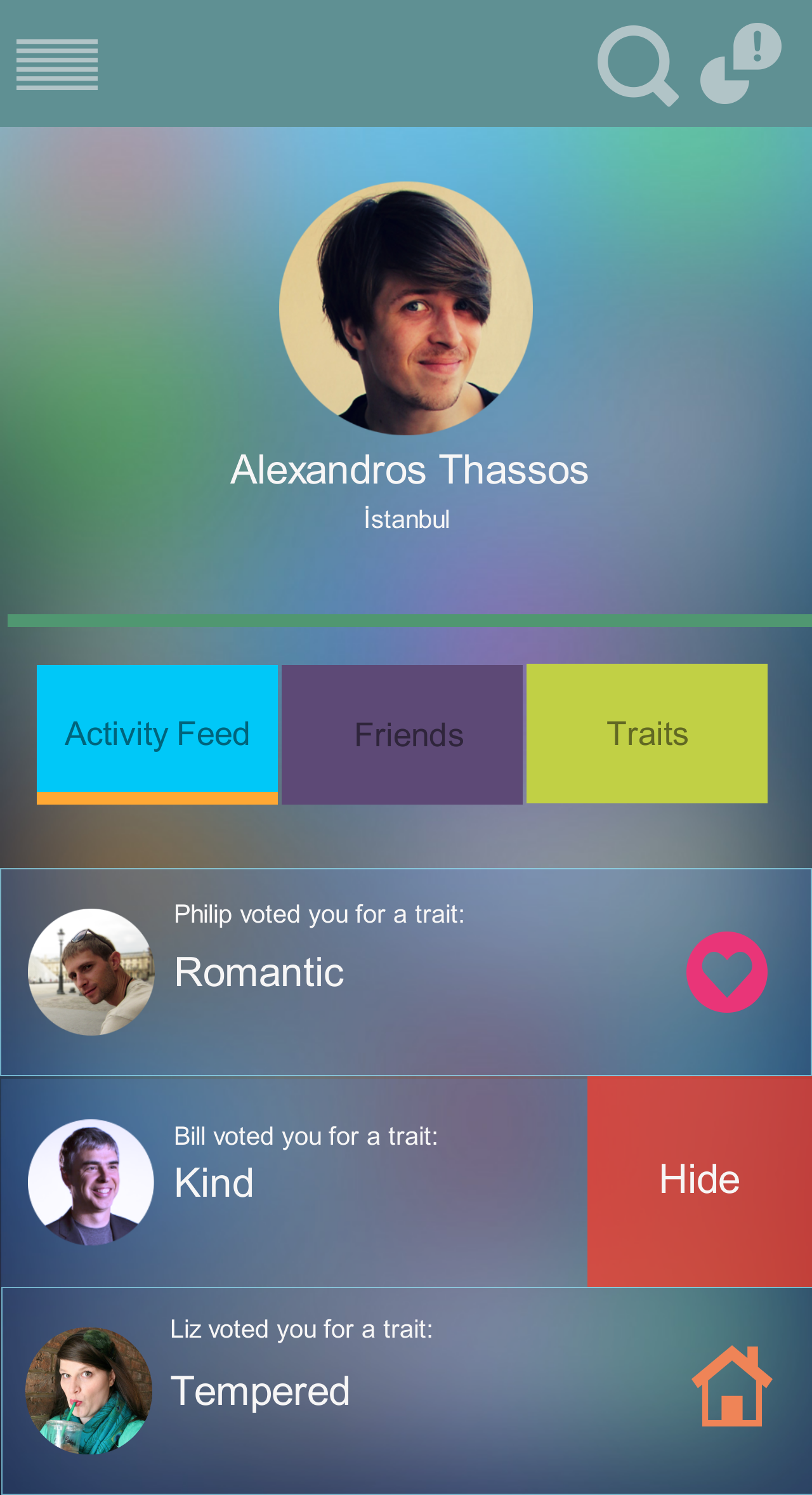 A typical example usage scenario starts as follows: User logs in with Facebook account and activity feed screen appears. On activity screen, friend activity such as "Friend A endorsed Friend B for personal trait X", or "Friend C voted `yes` for this endorsement" or "6 friends voted `nay` for another endorsement", etc, is displayed.