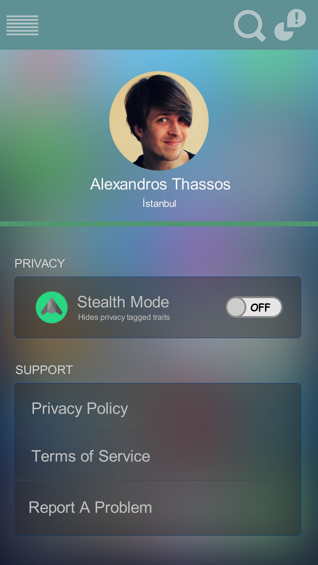 It should have two main sections: PRIVACY and SUPPORT. Privacy section should contain a switch for stealth mode, which helps users to hide some content. There should be a logo for stealth mode.