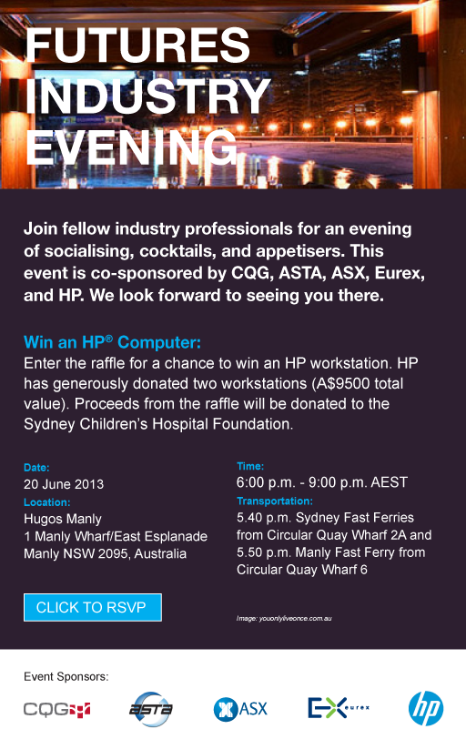 Join fellow industry professionals for an evening of socialising, drinks and appetisers. This event is co-sponsored by ASTA, Macquarie Bank, Trading Technologies, Thomson Reuters, ASX and EUREX