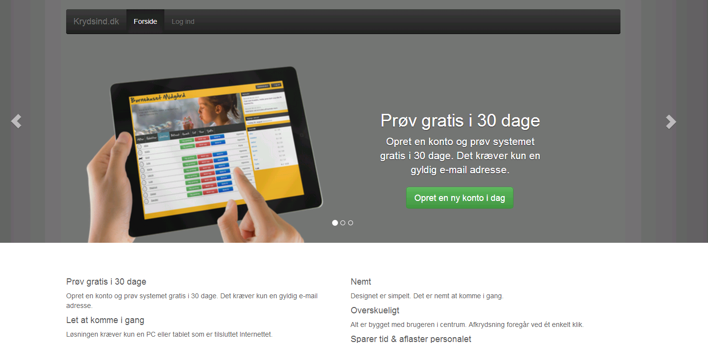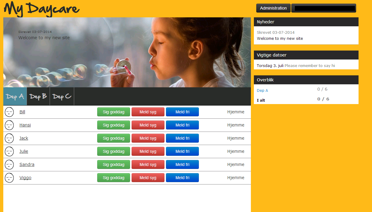 - The words "My daycare" in the logo, since this is only an example of a customer, using the product. My daycare will be replaced with the name of the customer. The product is called krydsind.dk.