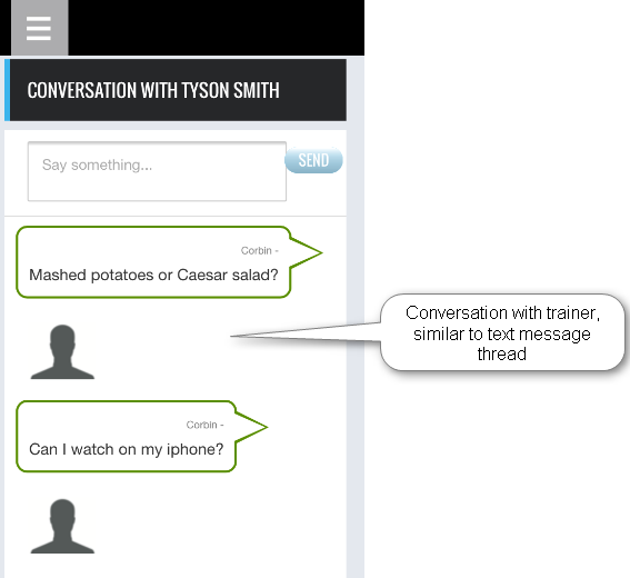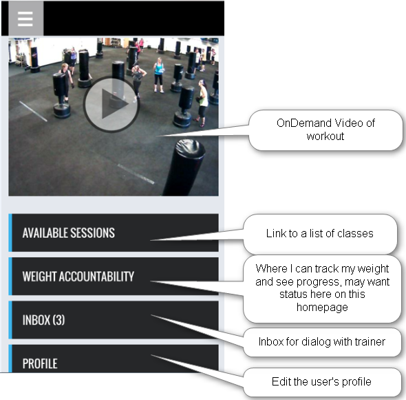 The app will display videos of live workouts, provide the ability to communicate to a trainer through an inbox, and the ability to track weight over time.