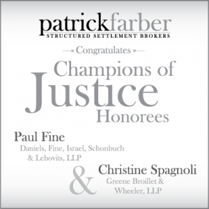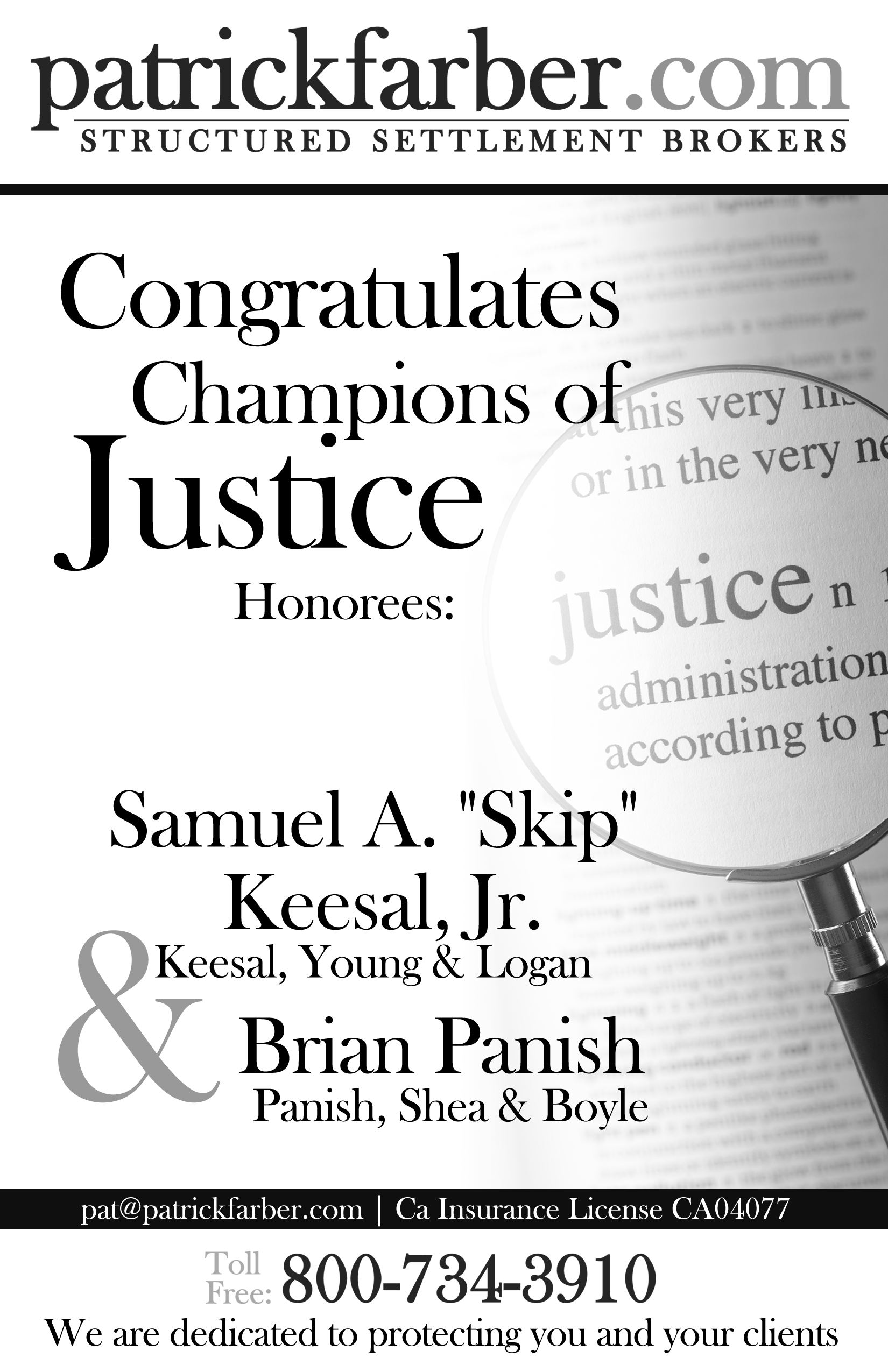 We need a half page ad (Height: 4 1/4" X Width 5 1/2" [including border]) to include in a booklet for an upcoming lawyer event. The name of the event is Champions of Justice. The purpose of the event is to honor attorneys: William Shernoff of the law firm Shernoff Bidart Echeverria Bentley LLP and Louis “Duke” DeHaas of the law firm La Follette, Johnson, DeHaas, Fesler & Ames.