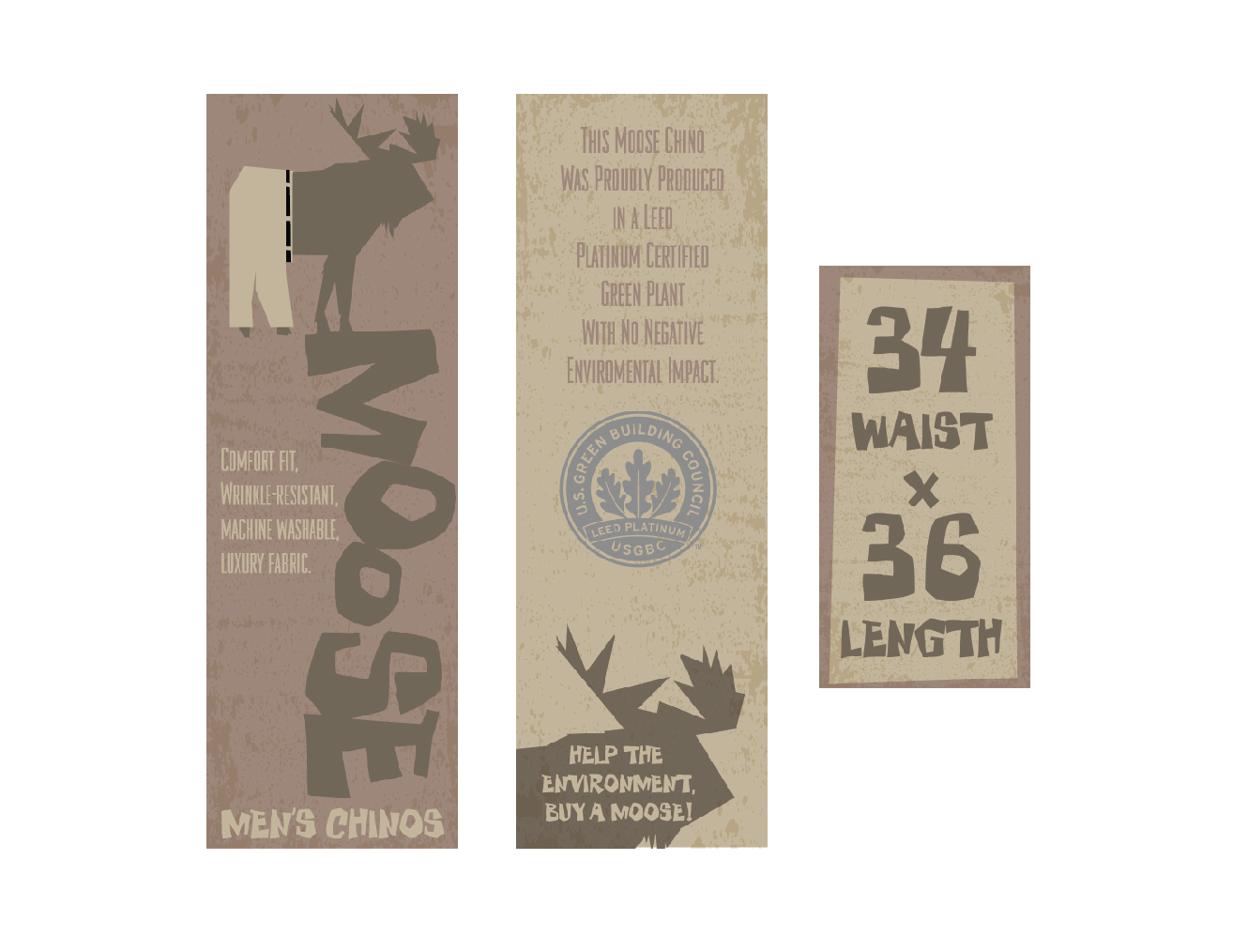 The pant is folded and packaged in a poly bag. We require a label design for the brand name Moose. The main label will be attached by a string on the belt loop. the size of that label will 25cm in length and 10cm wide. This is the first label the customer see's when she picks up the garment. Therefore, we require an eye catching design for that. If required it could have certain information about the pant on the main label such as Comfort fit, Wrinkle-resistant, machine washable, luxury fabric. But, if you feel that adding the above information spoils the design of the label then it is not a must to include the above information. On the back of the label we like to include the information that this pant was manufactured in an Leed Platinum certified green plant and hence the damage to the environment because of the plant is nill.